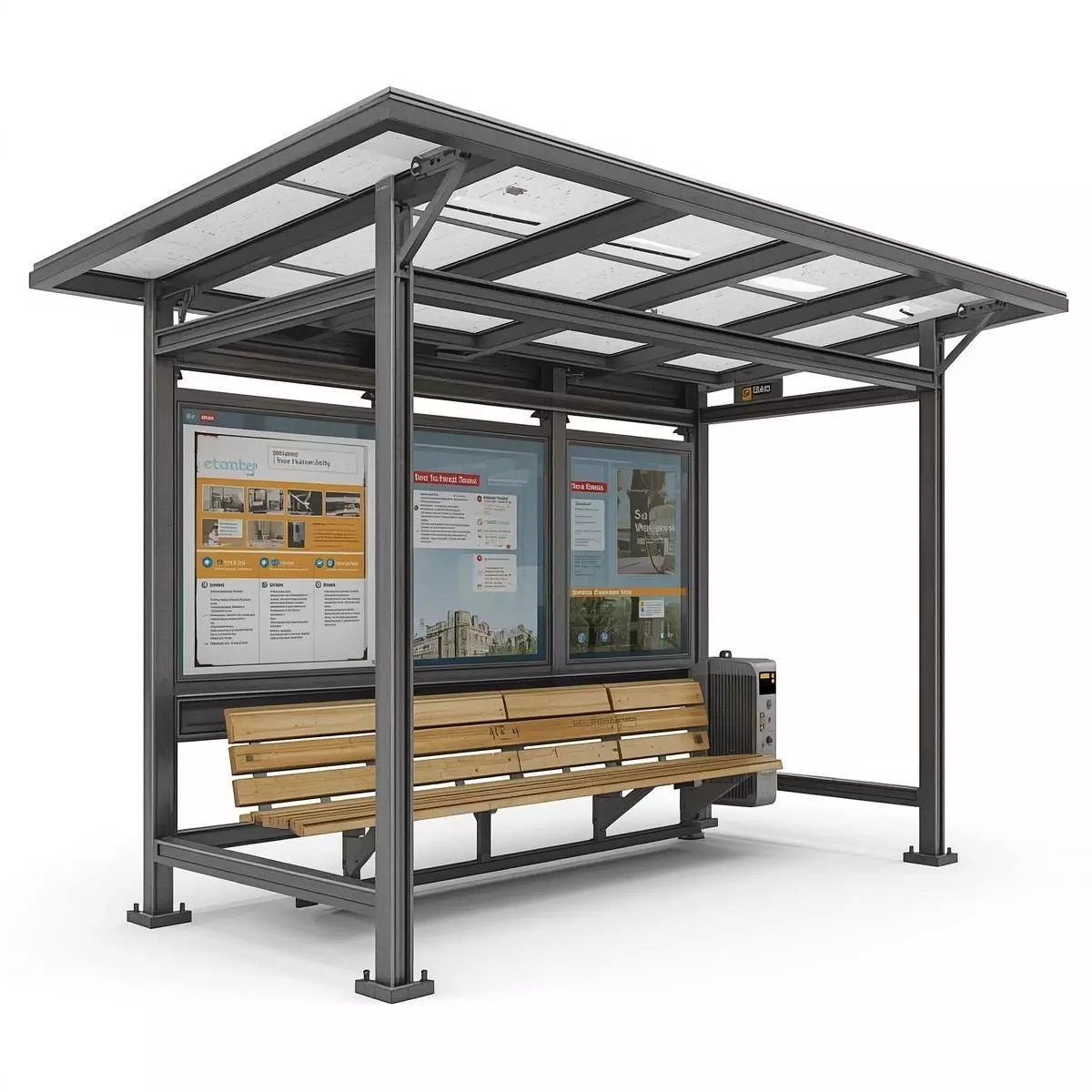 Integrated Public Seating: Includes a long, three-slat wooden bench with a visible light-grain texture, mounted directly to the frame.