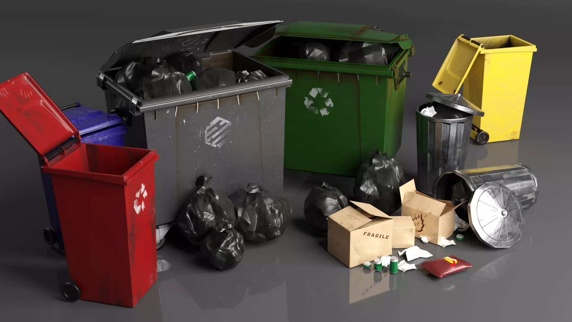 This pack includes: • 2 Dumpsters: 2048x2048 texture with 2 different colors and 2 levels of dirt • 3 Trash Bins: 2048x2048 texture with 3 different colors and 2 levels of dirt • Trash Cans: 2048x2048 texture with 2 levels of dirt • Trash (3 carboard boxes, 3 types of paper, 3 soda cans): 2048x2048 texture • 5 Garbage bags: 2048x2048 texture