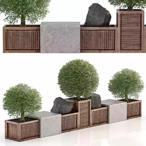 Description:High-quality 3D model of a modular urban furniture set featuring wooden and stone planter boxes with integrated decorative rocks and trimmed trees. The design combines natural materials and clean geometric forms to create a balanced, elegant structure suitable for both outdoor and semi-public spaces.Each component has been carefully modeled to ensure realistic proportions and a natural look of the foliage and stone surfaces. The combination of wood textures and subtle concrete elements gives a contemporary yet organic aesthetic, perfect for parks, terraces, courtyards, and commercial outdoor visualizations.The model is fully prepared for V-Ray and Corona render engines with optimized topology, clean UVs, and physically accurate materials. Ideal for use in exterior architectural scenes or landscape visualization projects.