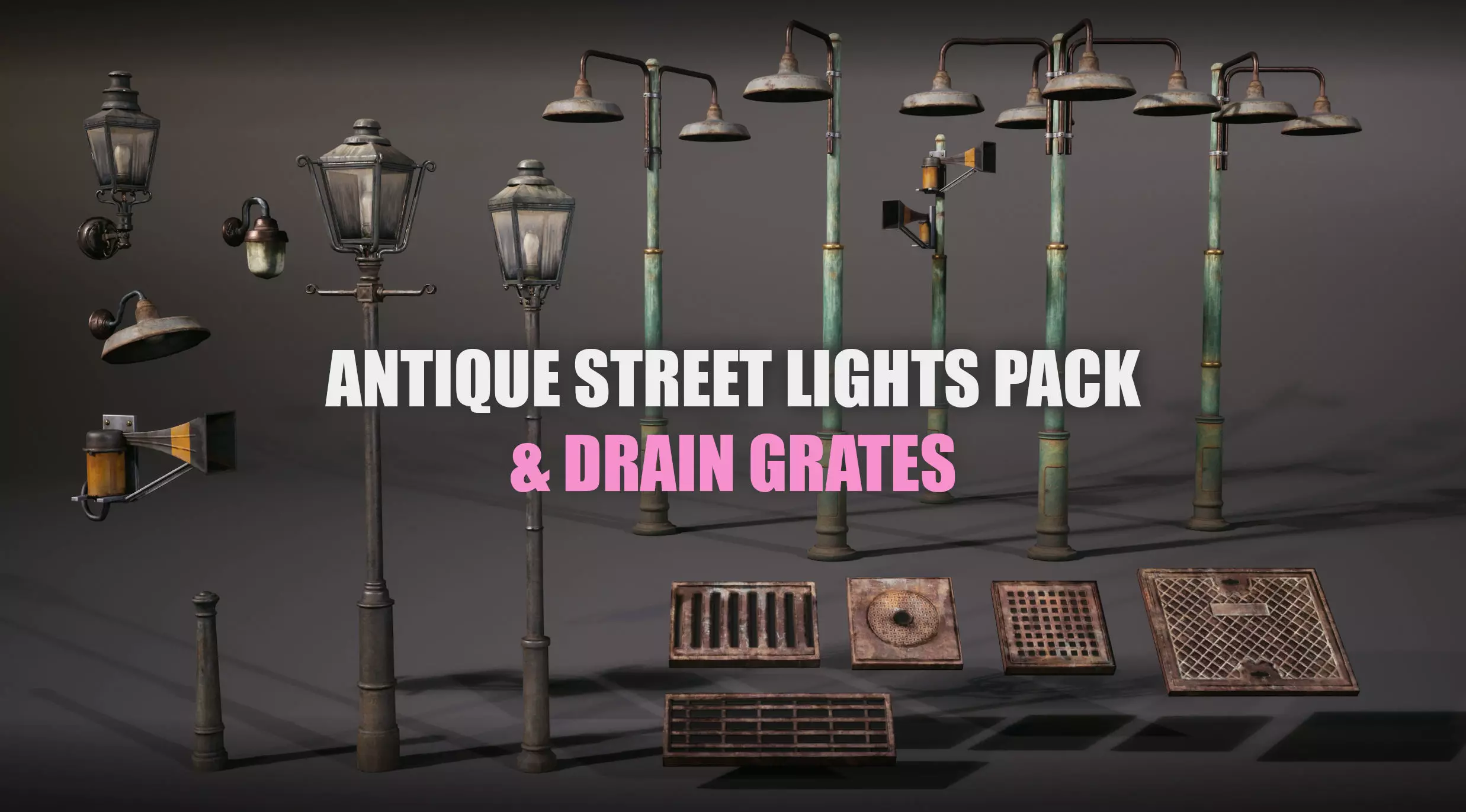 The pack includes multiple lamp variations — free-standing poles, wall-mounted lanterns, and industrial-style lamps, as well as storm drain grates and manhole covers to complete street-level details.