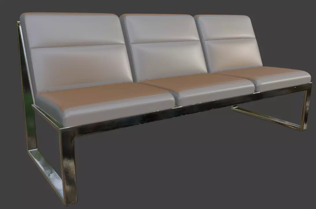 High-quality 3D model of a modern 3-seater airport waiting bench with sleek chrome metal frame and comfortable padded gray upholstery on seats and backrests. This beam-style public seating features sturdy angled legs, armrests, and realistic metallic reflections, ideal for airport terminals, hospital waiting rooms, train stations, office lobbies, clinics, and other public spaces.Perfect for architectural visualization, interior renders, game environments, VR/AR experiences, and urban scenes. The model is optimized with clean topology, UV unwrapped, and PBR materials for high realism while maintaining performance.Key Features: