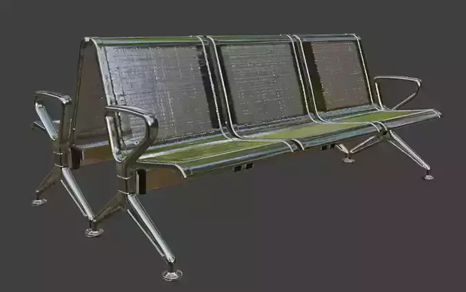 High-quality 3D model of a modern 3-seater airport waiting bench with sleek chrome metal frame and comfortable padded gray upholstery on seats and backrests. This beam-style public seating features sturdy angled legs, armrests, and realistic metallic reflections, ideal for airport terminals, hospital waiting rooms, train stations, office lobbies, clinics, and other public spaces.Perfect for architectural visualization, interior renders, game environments, VR/AR experiences, and urban scenes. The model is optimized with clean topology, UV unwrapped, and PBR materials for high realism while maintaining performance.Key Features: