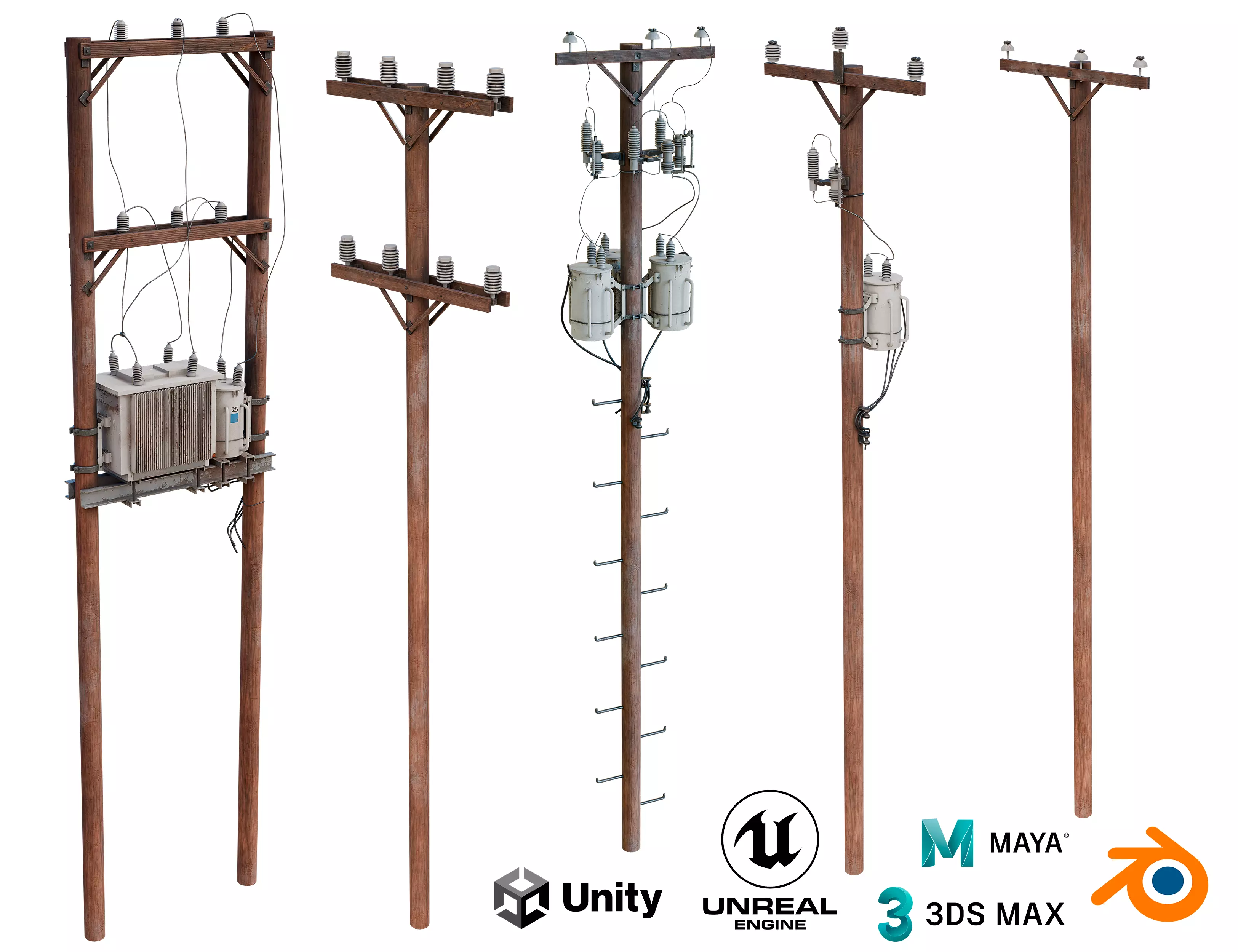 5 varioations of LP model of Wood Utility Poles with some cables and high texture resolution. Feel free to use it in your project or or as an in-game asset.Can be used as game asset or render prop in your scene.