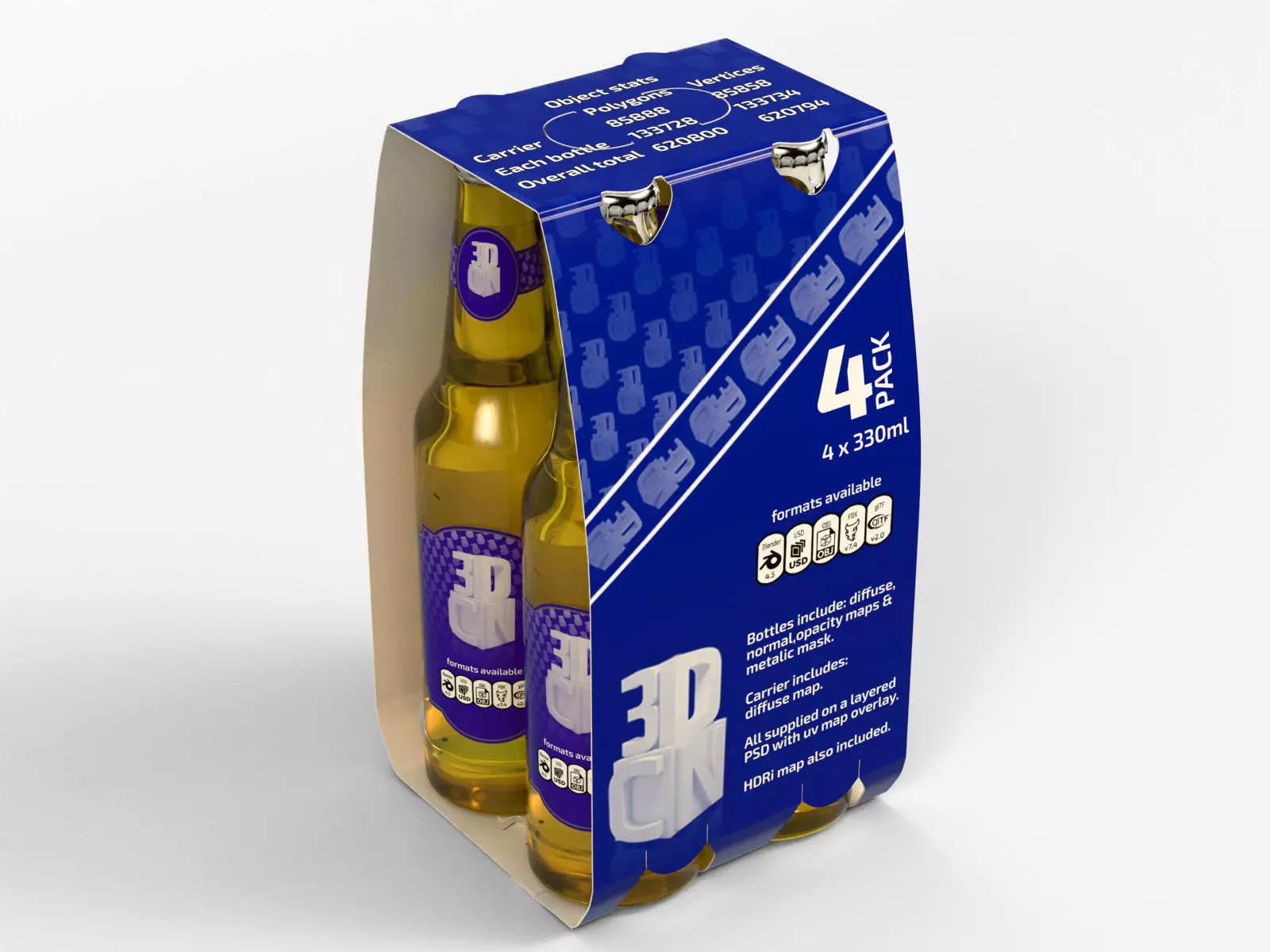 Cardboard Beer Carrier model. Perfect for product visuals used for marketing projects & advertising. The outer cardboard & the labels used on the bottles has been fully unwrapped, so making custom textures is easy. A photoshop template is included for the carrier with the UVW mesh overlay as a separate layer. Available to download in these formats: blender 4.5, OBJ, FBX, glTF, USD.