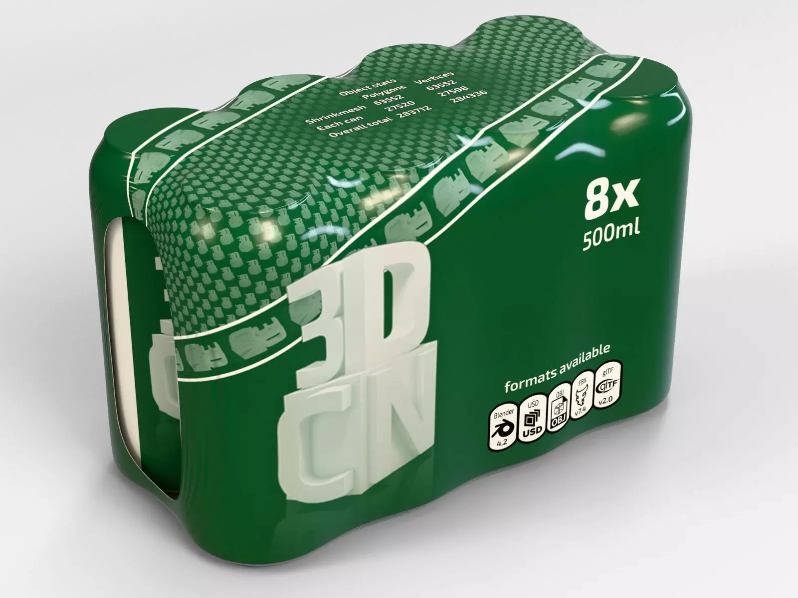 8 pack 500ml Shrink-wrapped Beverage Cans 3D model available to download in these formats: blender 4.2.7, OBJ, FBX, glTF, USD.