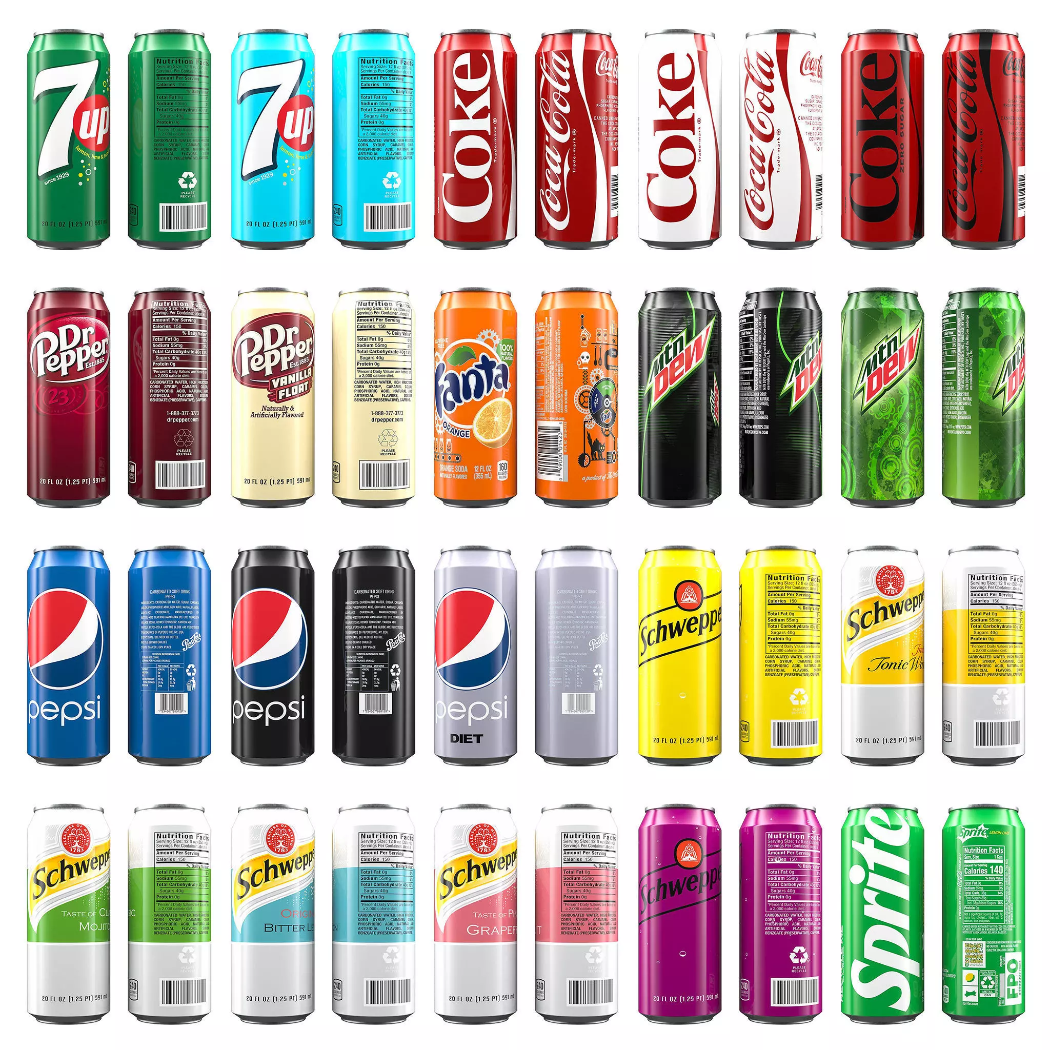 A set of 20 types of sodas in 0.5L aluminum cans.Can be used to fill shelves in stores, bars, etc., for both close-up and long-range shots.The polygon count for one can model is 3,758.The total polygon count for 20 cans is 75,160.
