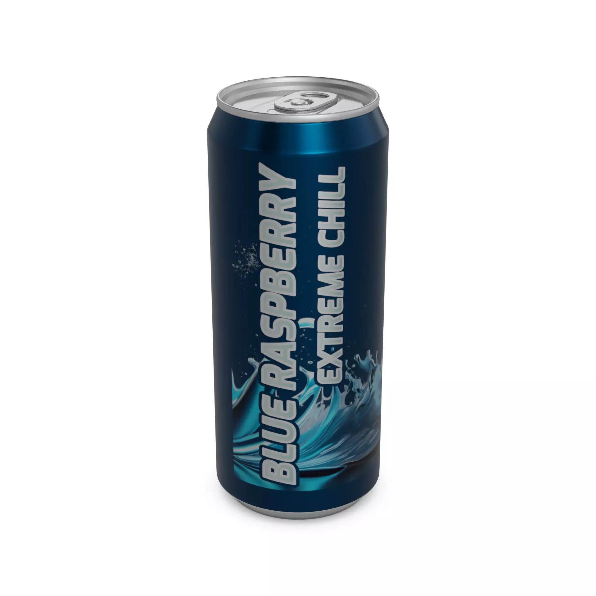 Blue Raspberry Rush: A metallic blue, 250ml slim can with a frosty appearance, featuring a dynamic splash of blue liquid on the label; the pull-tab is silver, and the label boasts Blue Raspberry, Extreme Chill with icy lettering effects.