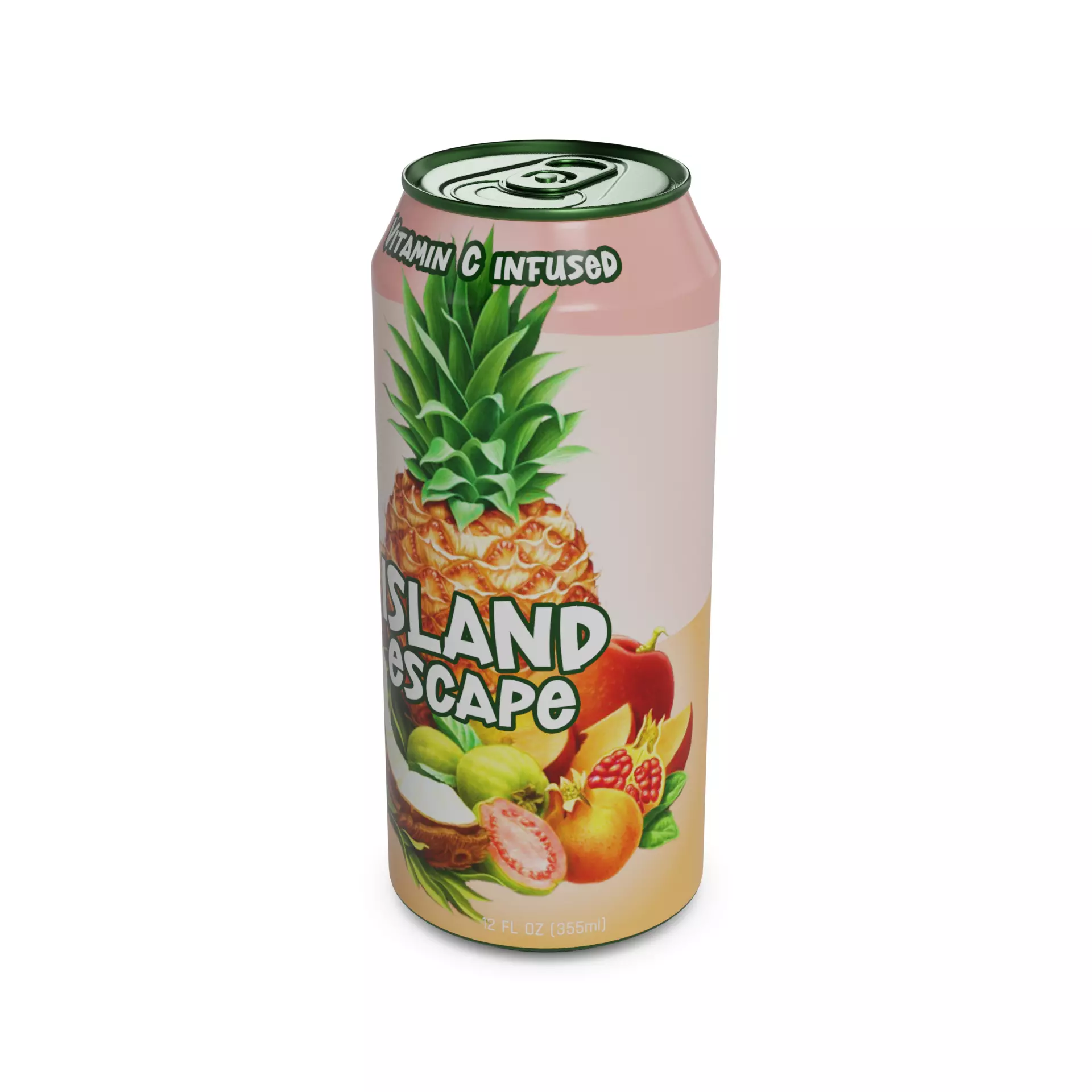 Tropical Breeze Soda: A bright orange, 355ml sleek can with a matte finish, adorned with images of exotic fruits like mangoes and pineapples; the can has a green pull-tab and the label says Island Escape, Vitamin C Infused in a fun, island-style font.