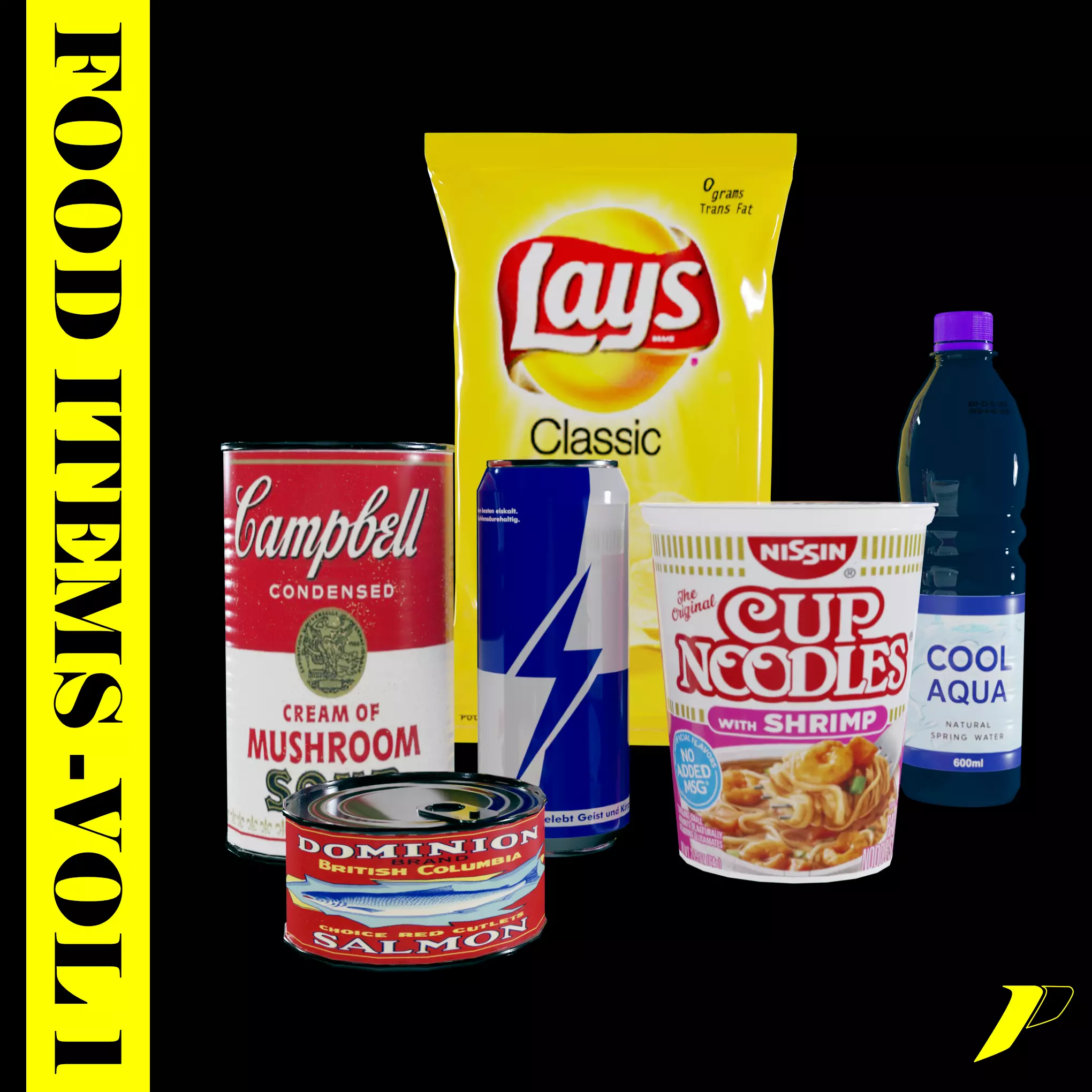 1. Energy drink, chips, salmon can, soup can, water bottle, and cup noodles. Free additional texture sets for salmon can and a soup can.
