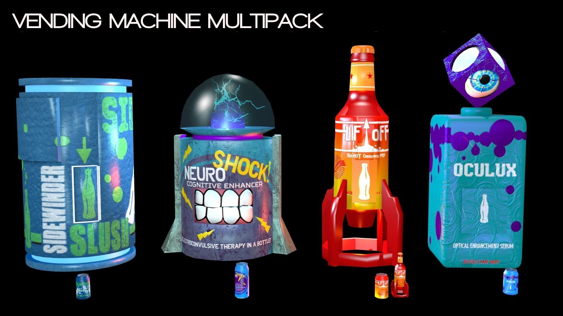 Pack includes four (4) game ready vending machines for perks, powerups, ammunition, or health pickups (plus one bonus variant), and five (5) beverage containers (4 cans and 1 bottle). All meshes and images are optimized to load fast and smooth in-game, and still look very nice up close. All images and texture are included.