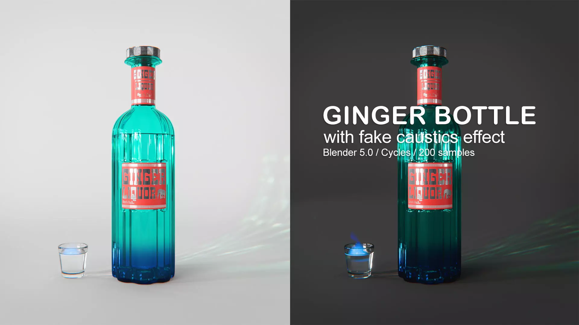 This product become with a special Node Group which simulates the caustics produced for the glass material of the bottles.