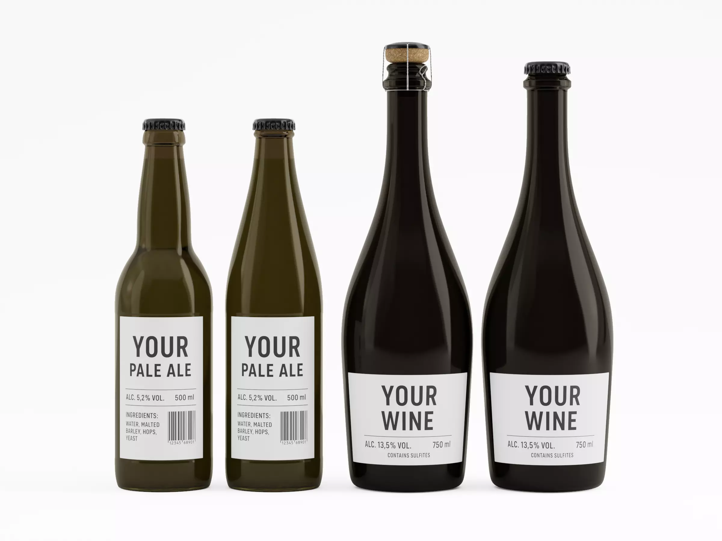 Set of 4 type glass bottles: 2x beer 500ml bottles and 2x 750ml wine/champagne bottles with different closing (metal cap, cork with muselet).