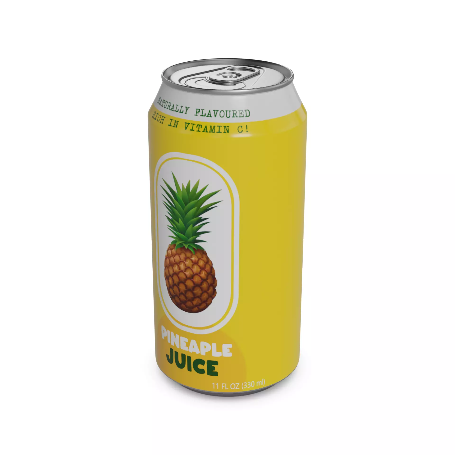 Pineapple Juice: Dive into the tropical paradise with every sip of this refreshing pineapple juice. Packaged in a vibrant yellow aluminum can, featuring a playful pineapple illustration. The can is adorned with a text label highlighting the high vitamin C content of the juice. Available in a 330ml size, ideal for enjoying on a sunny day.