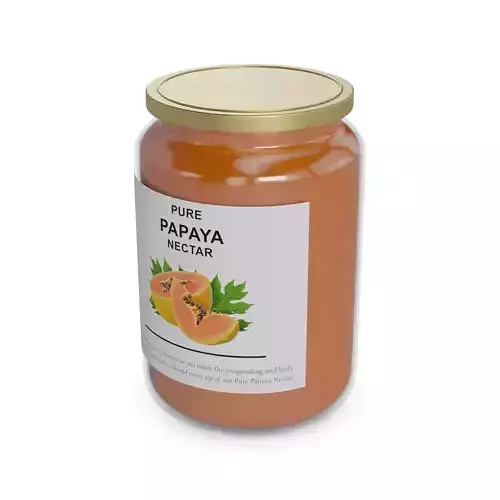 Papaya Nectar: Indulge in the tropical sweetness of papaya with this luscious nectar. Packaged in a round, glass jar with a sunny orange lid. The label features a picture of ripe papayas and the words Pure Papaya Nectar in a stylish font.