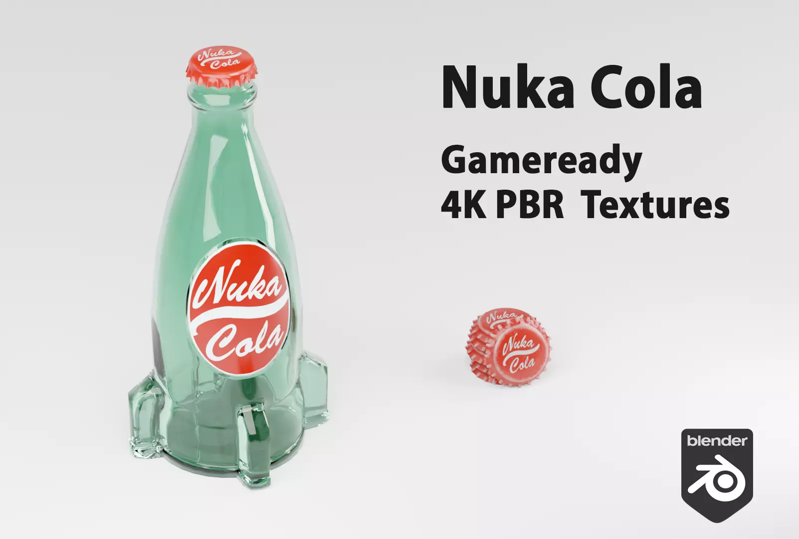 Nuka ColaThe bottle has a factory look with some minor dusting on the cap. The second cap is an open cap that was not packed on the bottle and used, it has scuffs and scratches on it.The scale of the model is in meters, if you need to use scaling down for realism. The rendering of the preview image is done in Cycles. Textures only, no additional customizations.Polygonal geometry. UV allows you to customize glass color, label on the bottle. Subdivision-ready. PBR metallic roughness.For best normal map results: In marmoset, use Flip Y (green channel). In Blender 3.6 and higher, use Non-color for the normal map.
