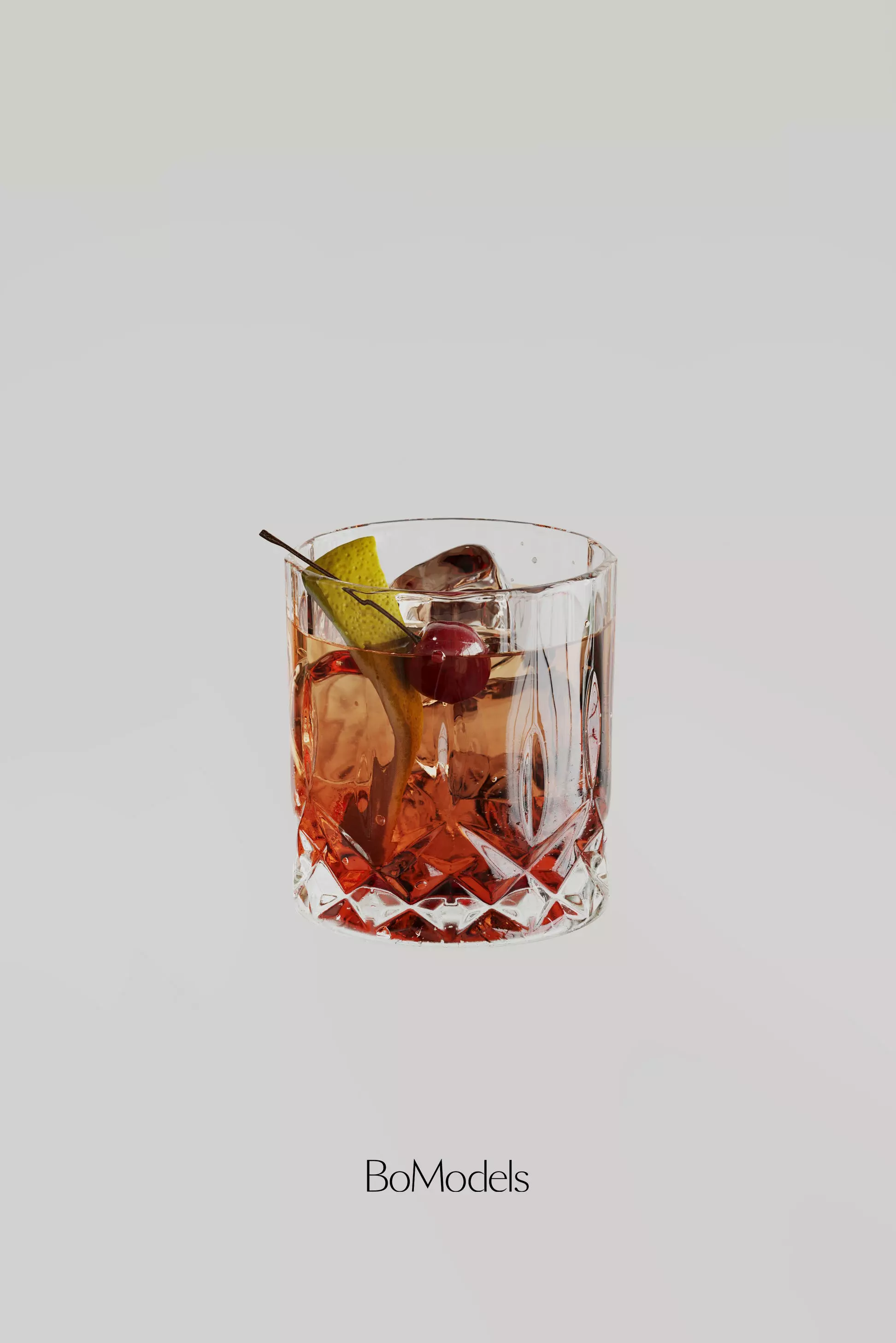 3D model of Old Fashion drink in orange color with ice cubs, cherry and lemon zest. Part of a Cocktail Collection.