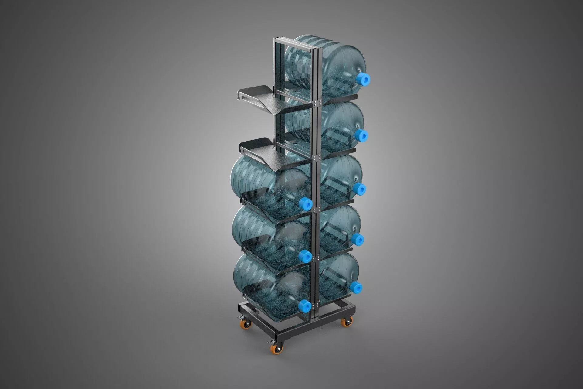 KEYWORDS: rolling, rack, cart, water, bottle, storage, gallon, caster, wheel, metal, steel, industrial, office, hydration, mobile, modular, stackable, heavy-duty, organizer, carboy