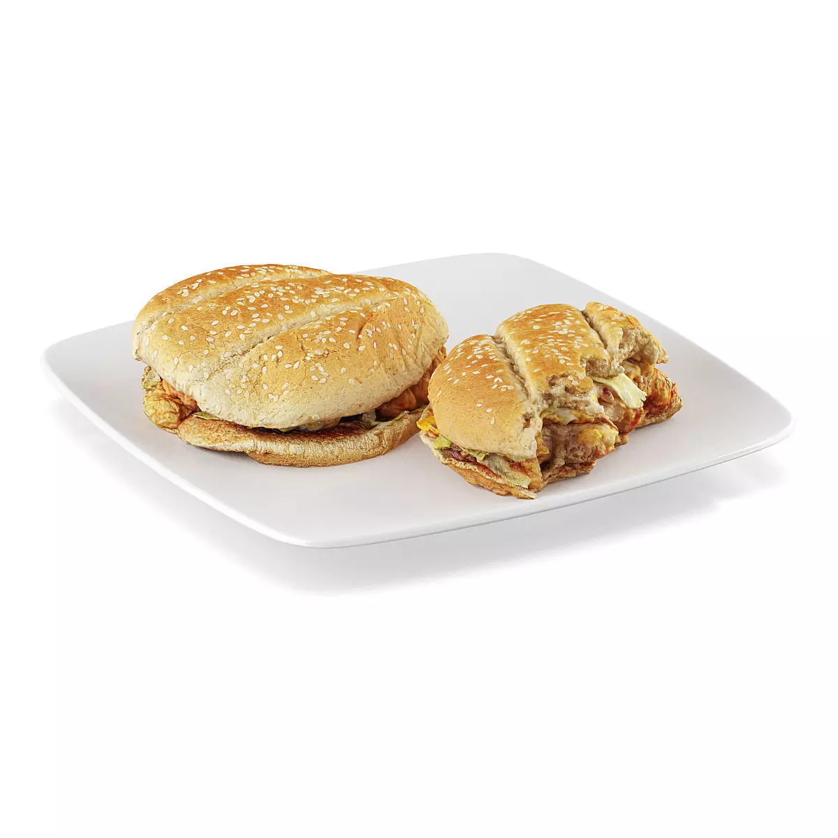 3d model of two sandwiches with fried chicken - one is half eaten. 3d scanned from real product. Placed on square white plate.
