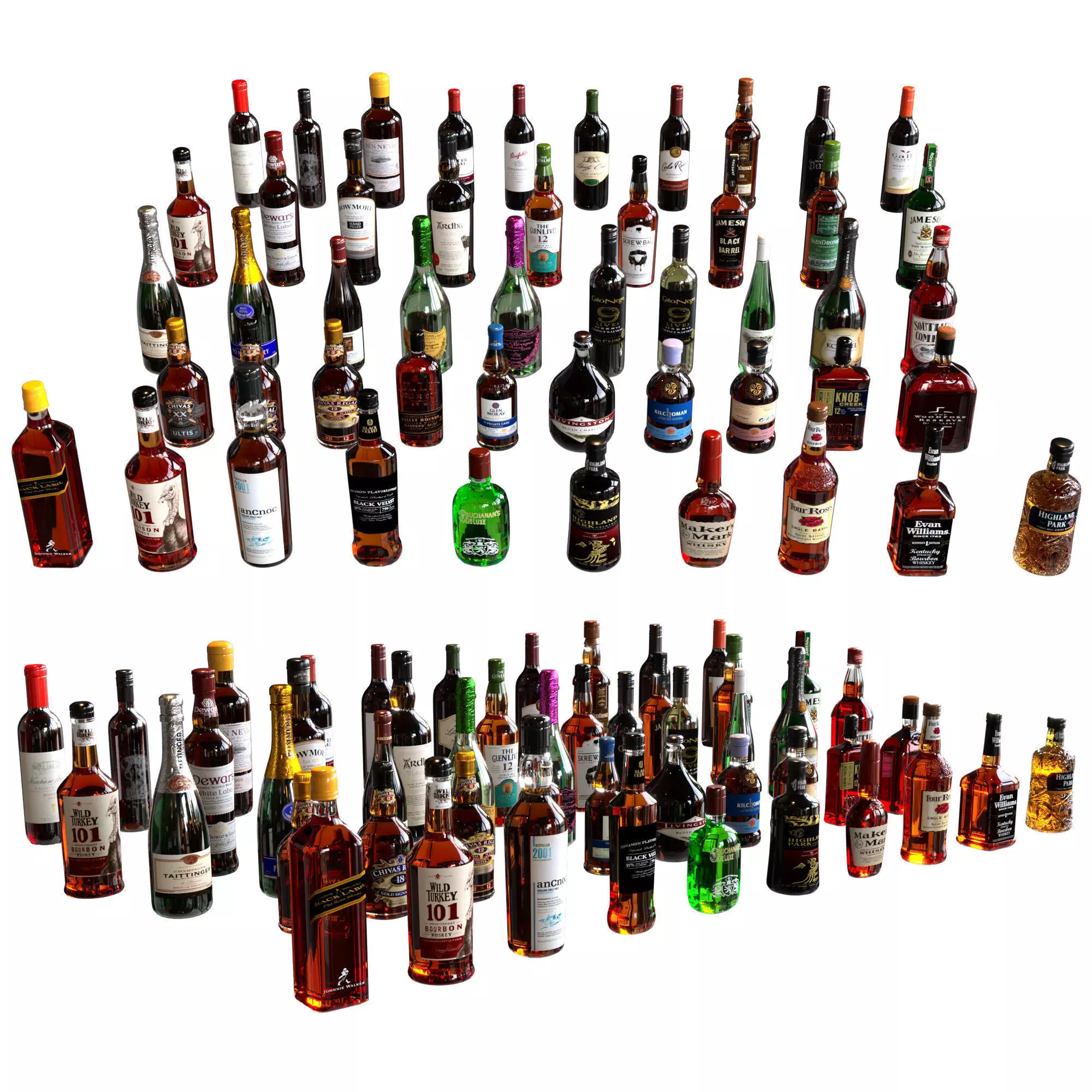 the model includes 50 different bottles(high detail modeling and texturing suitable for close rendering) of cognac and whiskeys from famous brands