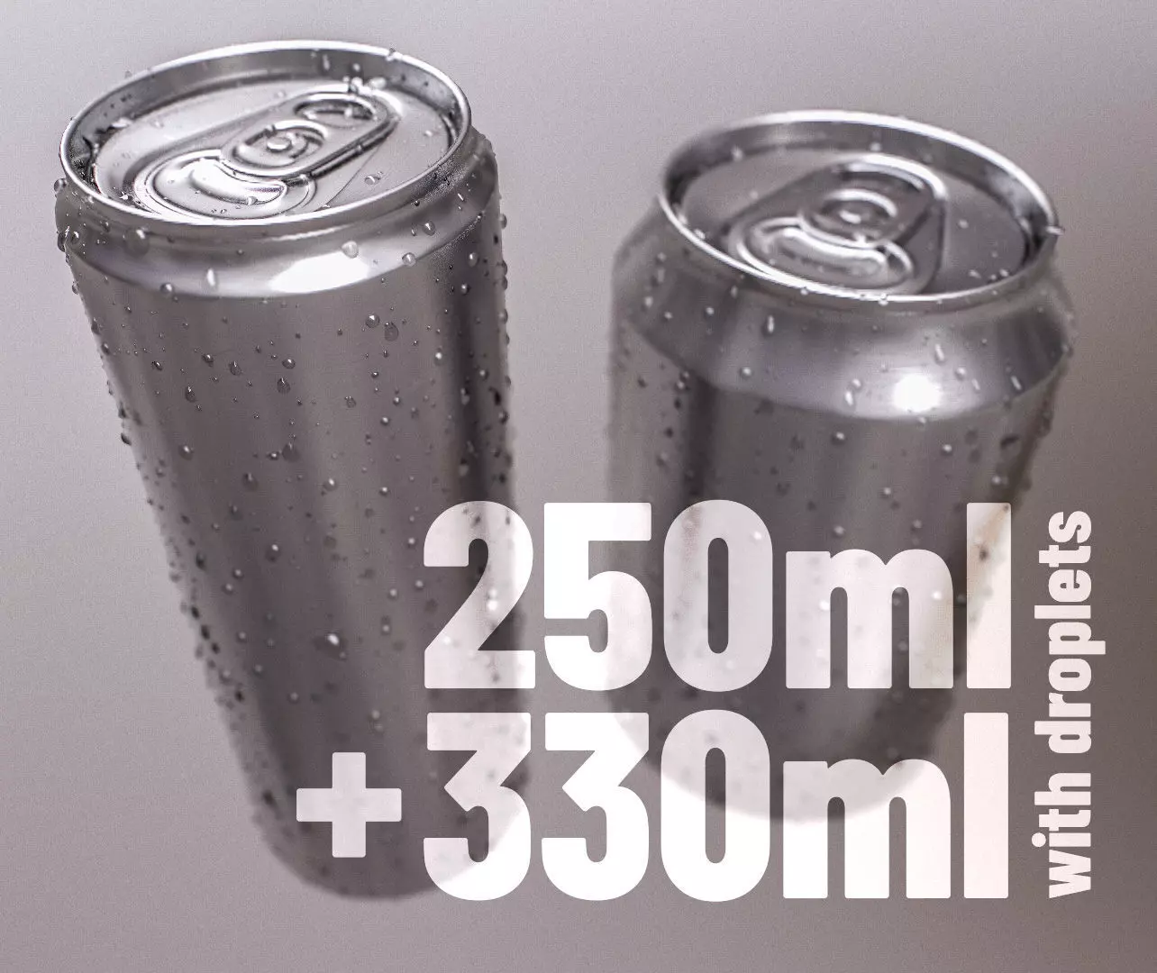 Detailed, clean mesh. UV unwrapped, modelled in real world scale. 250ml and 330ml can sizes, realistic droplets mesh included (optional). Label can be added without problems, VertexColor masked. 4K Normal Map with realistic scratches and bump, PBR aluminium material.
