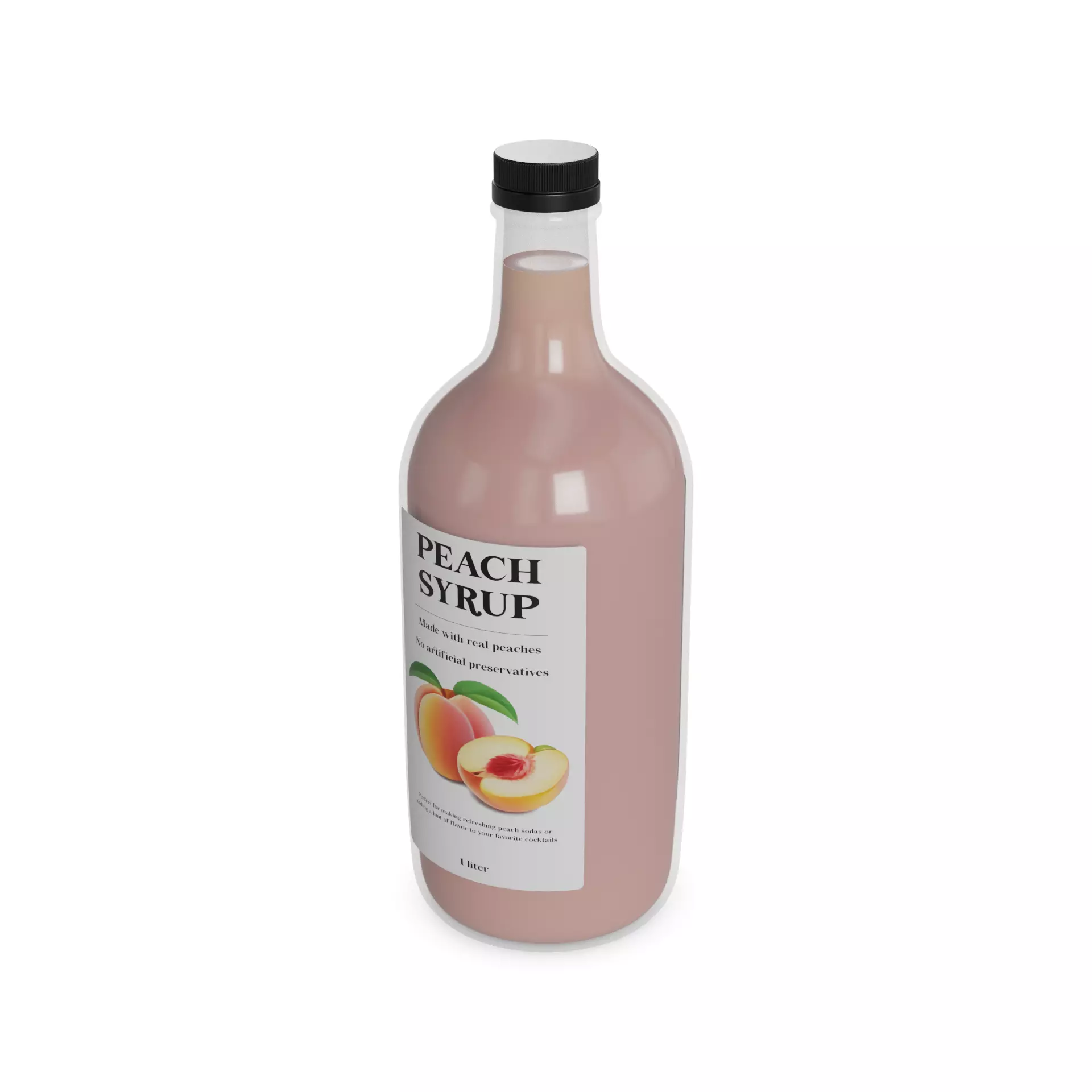 Peach Syrup: Savor the juicy and sweet taste of peaches with this peach syrup, packaged in a soft peach-colored plastic bottle with a flip-top cap. The bottle contains 1 liter of peach goodness, perfect for making refreshing peach sodas or adding a hint of flavor to your favorite cocktails. The label showcases a peach-themed design, with images of ripe peaches, and includes text labels such as made with real peaches and no artificial preservatives to highlight the natural flavor of this syrup.