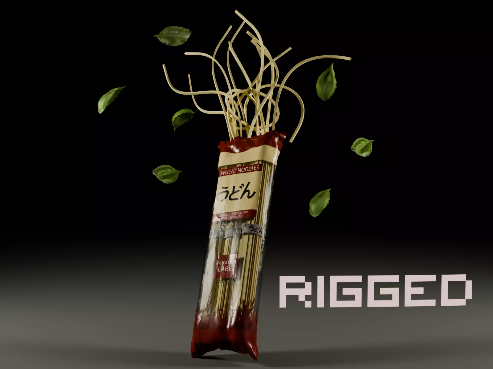 Udon noodlelarining soddalashtirilgan 3D modeli. U optimallashtirilgan teksturaga va past to'r zichligiga ega, bu esa kompyuterni yuklamaydi. To'qimalarning soddaligiga qaramay, to'plam oddiy xaritalarni o'z ichiga oladi, buning natijasida sirt real bo'lib qoladi. Model, shuningdek, animatsiya jarayonini soddalashtiradigan qurilmaga ega. Rivojlanish moslamasi noodle paketini ochish va yopish mumkin bo'lgan qo'g'irchoqdir.Formatlar: .blend, FBX, obj, glb.