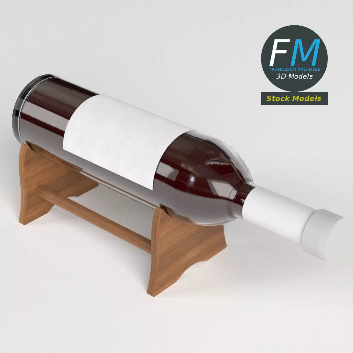 A red wine bottle on a wooden stand 3D Model; 4 objects (bottle, wine, label, stand), each one with its own non overlapping UV Layout map, Material and PBR Textures set. Production-ready 3D Model, with PBR materials, textures, and non overlapping UV Layout map provided in the package.