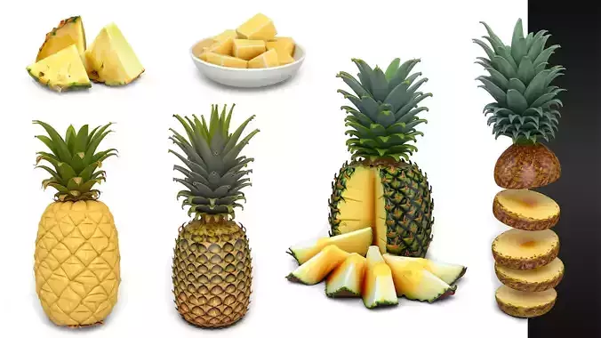 This pineapple bundle contains multiple models that can be used and customized to your needs.Either a full fruit or pieces of the pineapple. Slices, cutted parts, full pinapple or half cut models.
