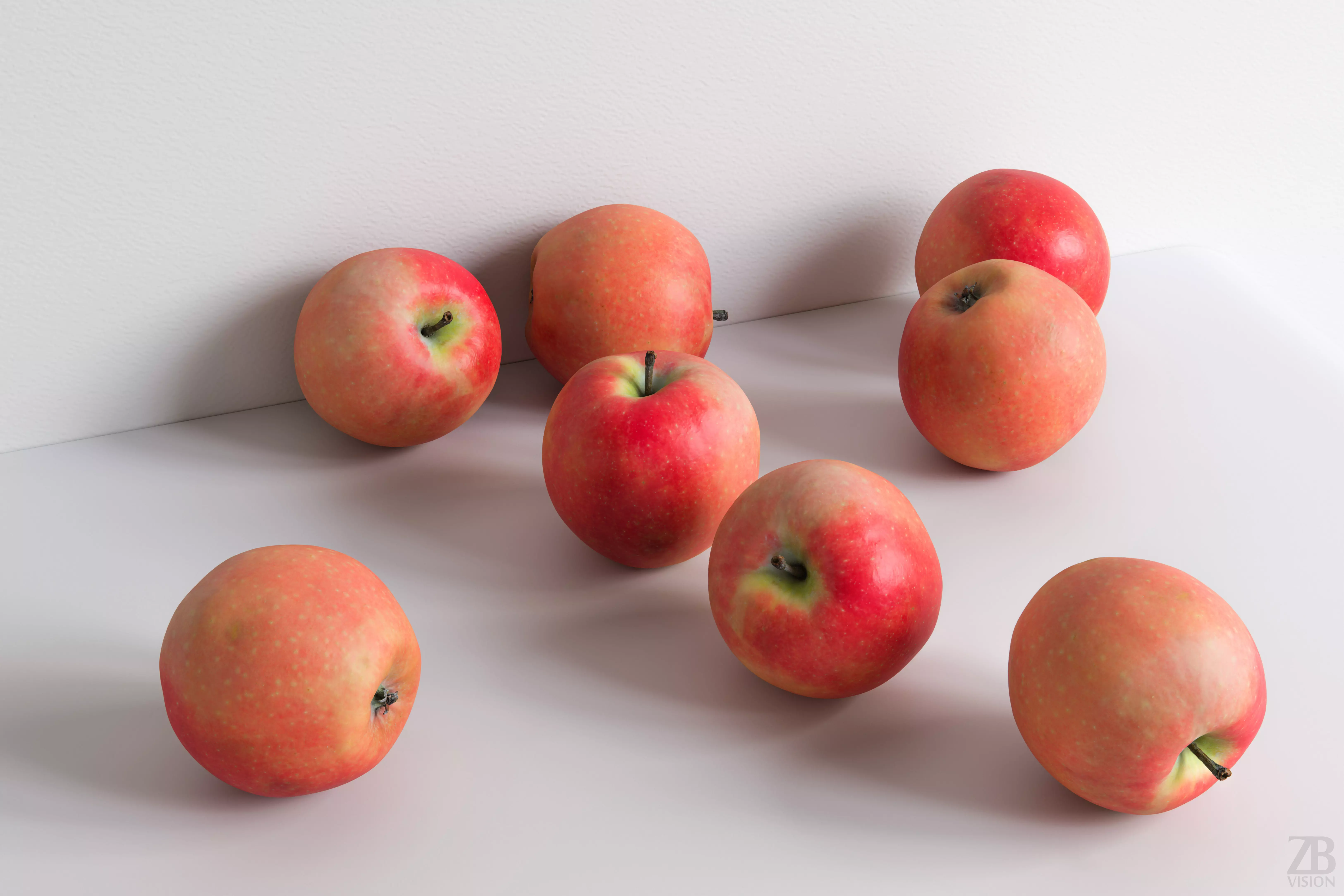 The apple model is presented as a single mesh in 3 subdivision levels: low, mid, and high. Meshes are quad based. The polycounts are 5K, 91K, and 1470K. The high-detail model is included in .max, .fbx, and .obj formats.