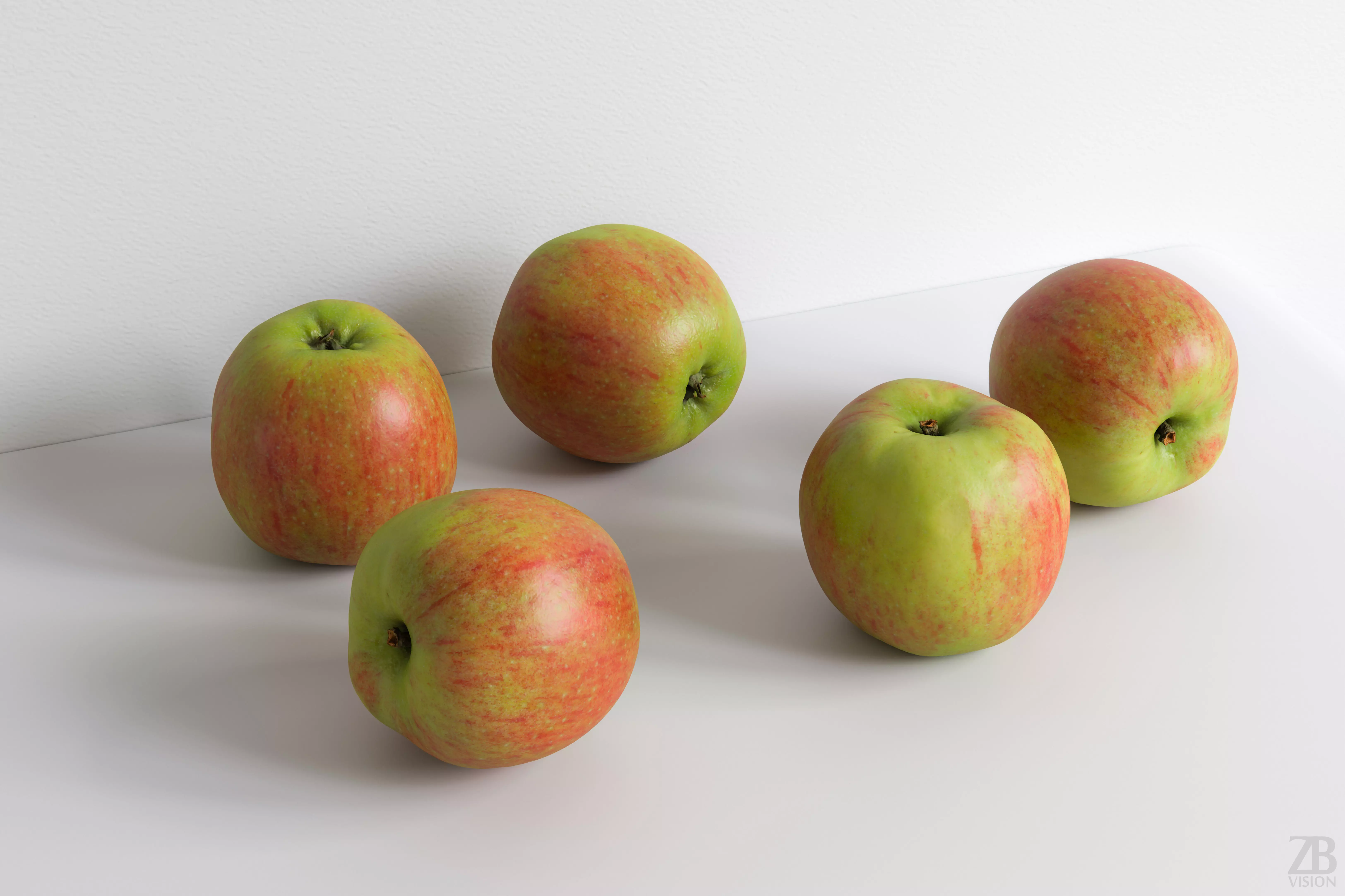 The apple model is presented as a single mesh in 3 subdivision levels: low, mid, and high. Meshes are quad based. The polycounts are 5K, 84K, and 1348K. The high-detail model is included in .max, .fbx, and .obj formats.
