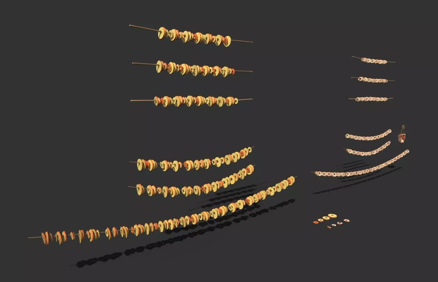 Low-poly sliced apples in freshly cut and dried out state. Some of them are threaded onto cords to hang them under the ceiling or directly above a wood stove for long term preservation. Others are threaded onto hazel sticks, that can be placed on a rack or between two larger sticks.This way of drying apple is a historic method to make them last longer and to have a supply of fruit during winter, even into spring.