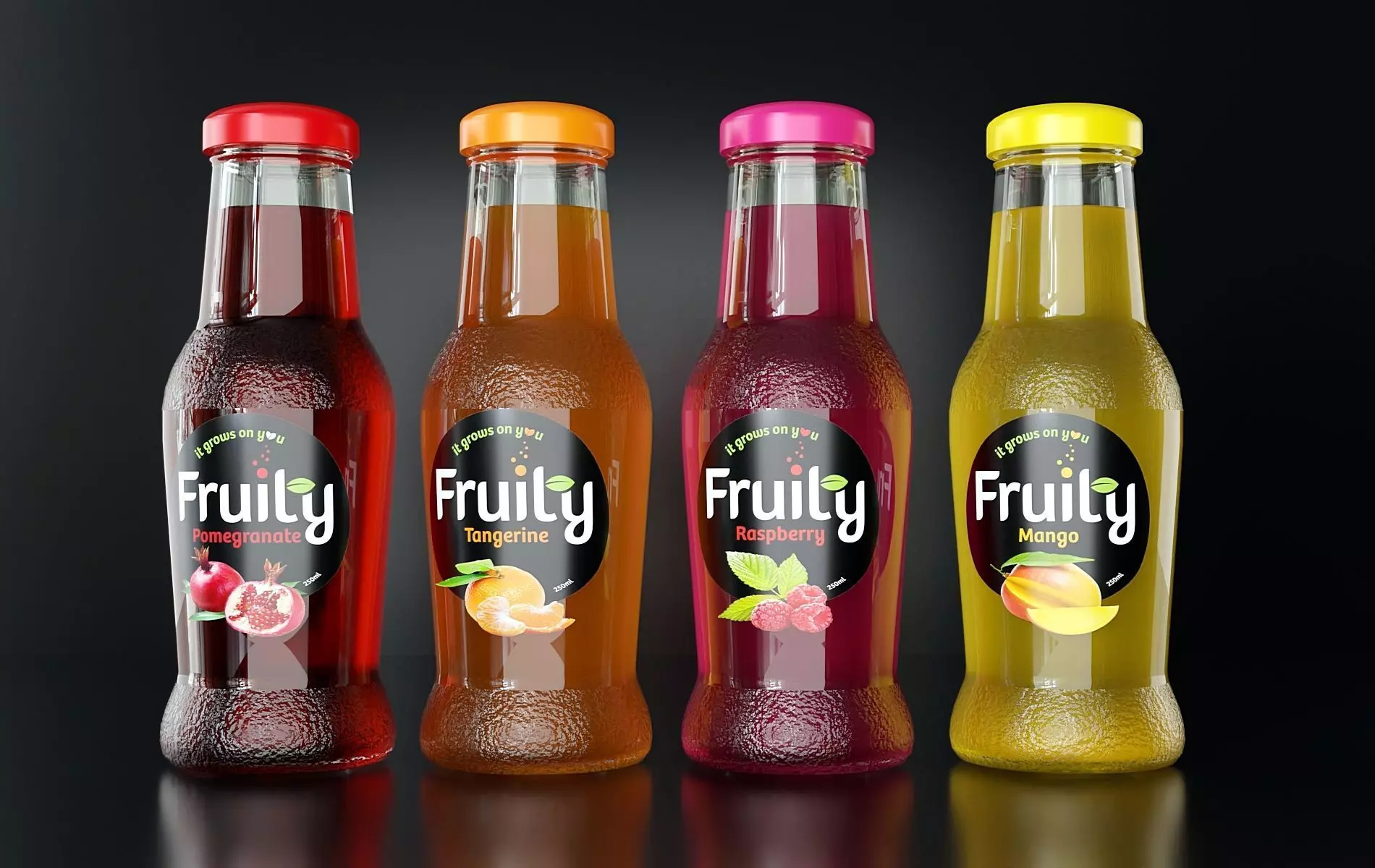 Four glass bottles with different juice. Scene of four objects (4 bottles - 4 objects. The caps are not separated) The liquid in the bottle is modeled with a separate mesh, but combined with it into a single object. The label textures are packed in a zip archive.