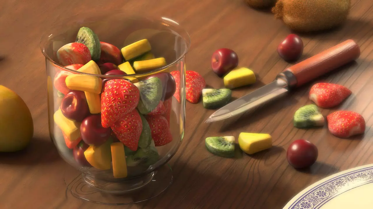 Fruits in a glass bowl on a wood table, all modeled in 3DS Max 2021, and rendered with VRAY 5