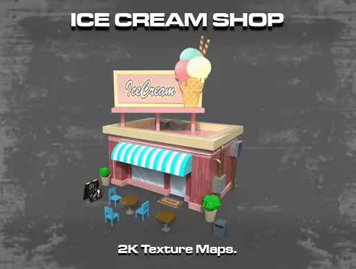 Ice cream shop for your game level. Comes with texture maps 1024 x 1024 and 2048 x 2048. Game ready for FPS and third person adventures. Source file included to allow for modifaction and generation of new texture maps.