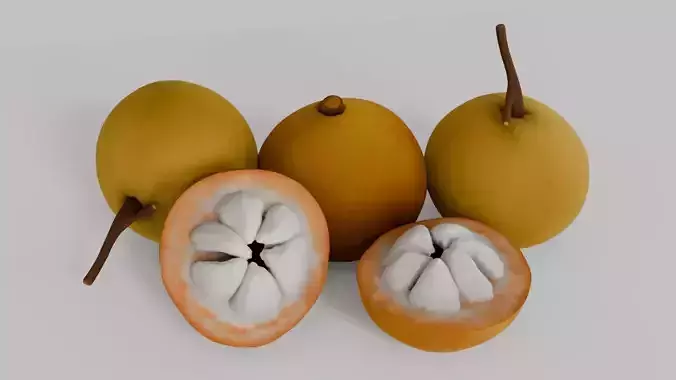 This detailed 3D model represents the Kecapi fruit (Sandoricum koetjape), a tropical delicacy native to Southeast Asia. The model includes whole fruits with their round, yellowish-brown skin and stems, as well as cut halves revealing the segmented white pulp surrounded by a thin orange rind. The realistic sculpting makes it ideal for botanical visualization, culinary scenes, educational projects, or game environments.Known by different names across the region:Indonesia: KecapiMalaysia: Sentul / KechapiPhilippines: Santol / SantorThailand: SantolIndia: Santol (in some regions)English-speaking countries: Wild MangosteenThis fruit is cherished for its sweet-sour flavor and cultural significance, often used in jams, juices, and traditional dishes. The model captures its exotic charm with clean topology and versatile export formats.