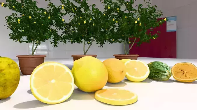 This high-quality 3D pack includes a complete lemon-themed collection featuring both plants and fruits. It is ideal for realistic scenes, product visualization, kitchen environments, and organic-style renders.