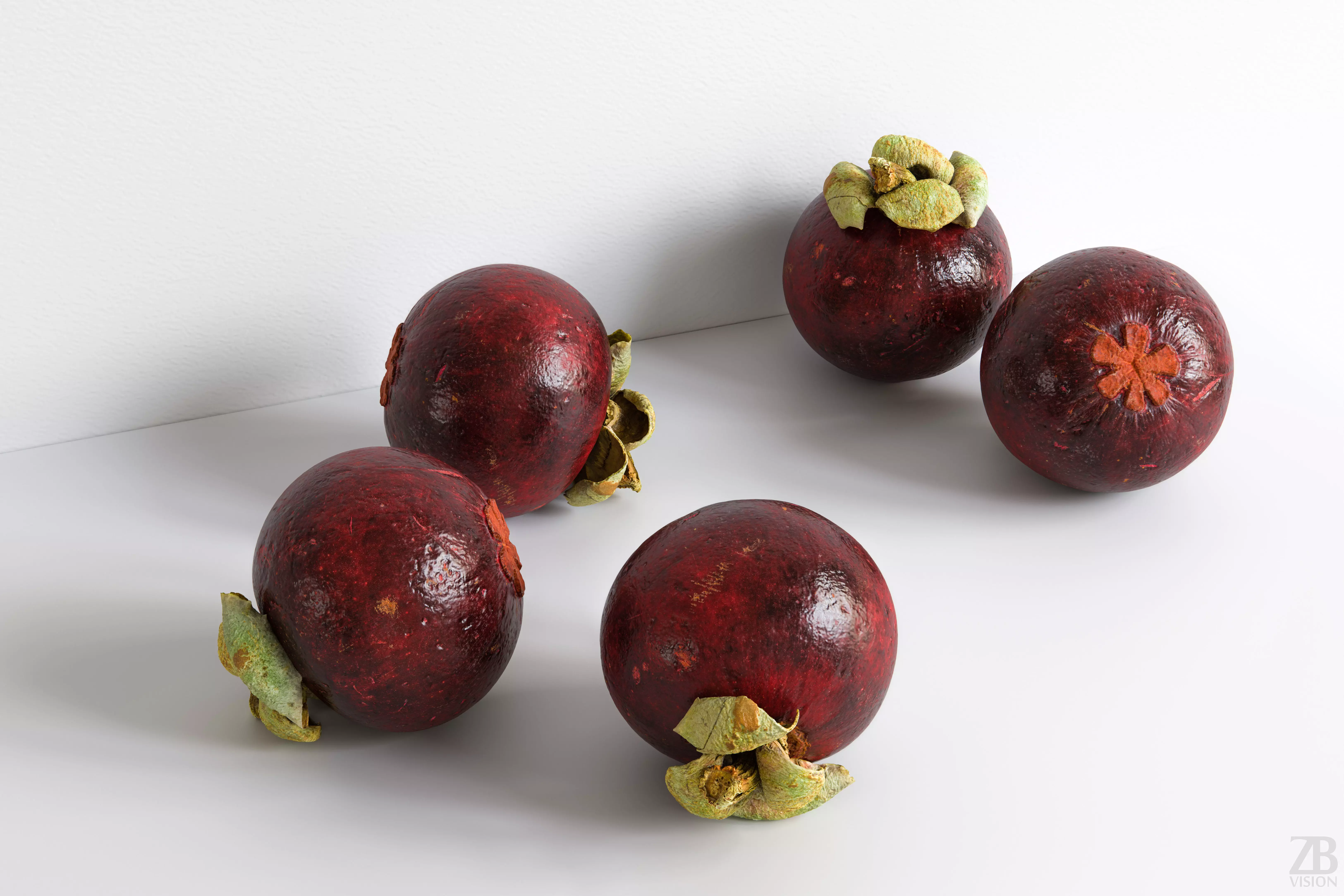 This is a 3d model of a mangosteen. It was scanned and prepared for photorealistic renderings, close-ups, stills and animation. The mangosteen model is ready to be inserted in your scene out of the box.