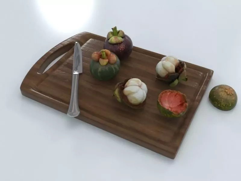 Made by Photogrammetry technic.The file content 3 Models of Mangosteen, High Poly and Low Poly.2 Models are a full Mangosteen and 1 Model is an Opened Mangosteen and his opened part.Include also a knife and the Wood Board.
