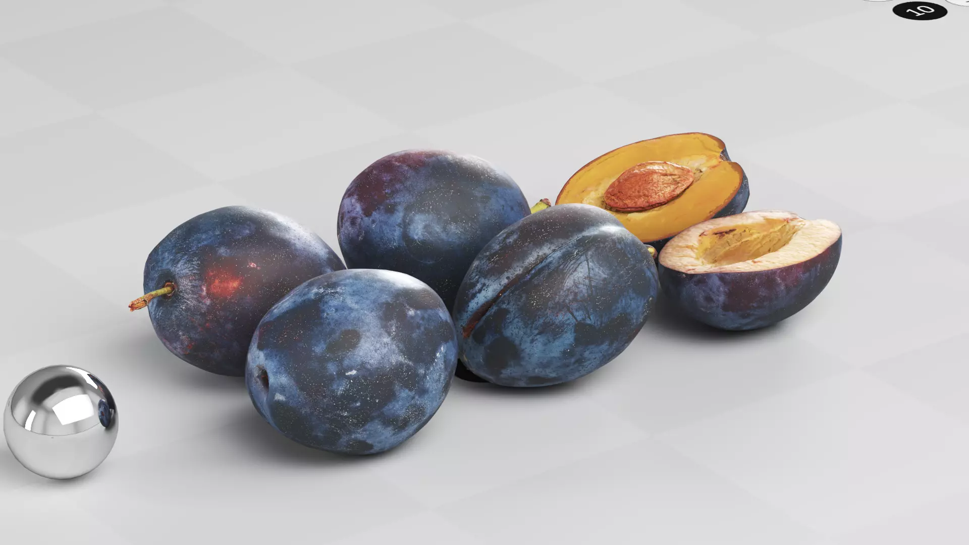 Plums Model. 4 pcs. One of which also split in half with seed.Full (2864 + 2448 + 1776 + 3254 polygons ) / Half1 (1940 polygons ) Half2 (1408 polygons ) Seed(1536)