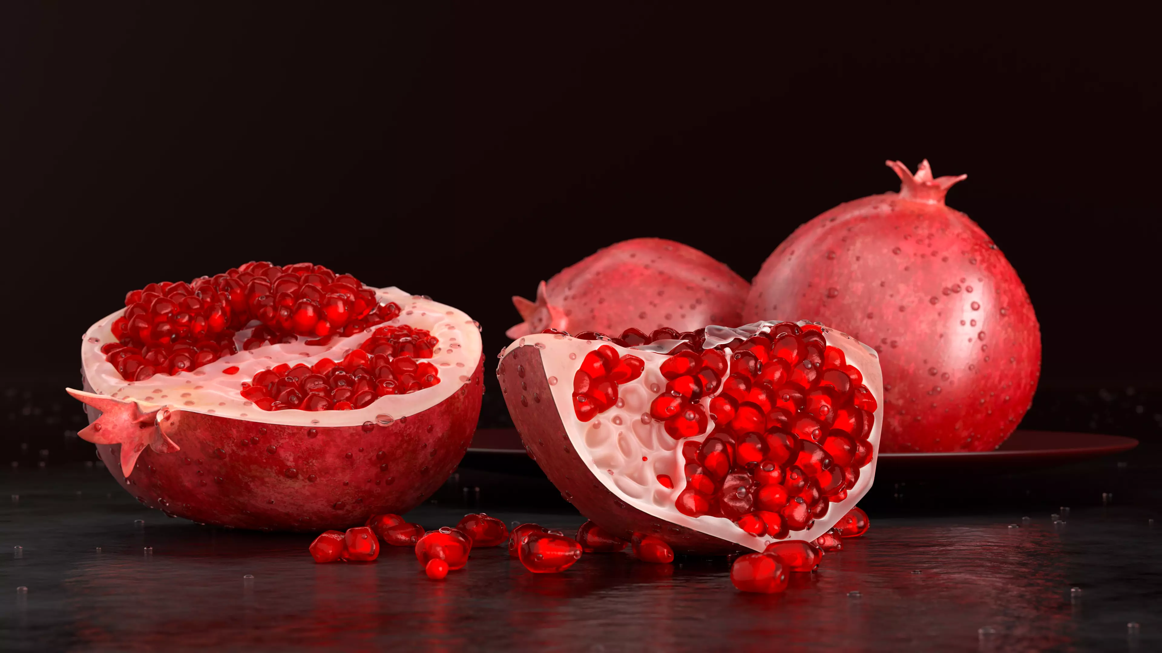This stunning 3D model features three luscious pomegranates on a dark background, with one of them split open to reveal the juicy red seeds inside. Some of the seeds are scattered on the table nearby, adding to the overall realism of the scene. The pomegranates are intricately crafted with realistic textures and details, making them perfect for use in high-quality still life scenes or as a decorative element in a kitchen or dining room setting. This 3D model is a must-have for anyone looking to add a touch of natural beauty to their projects.
