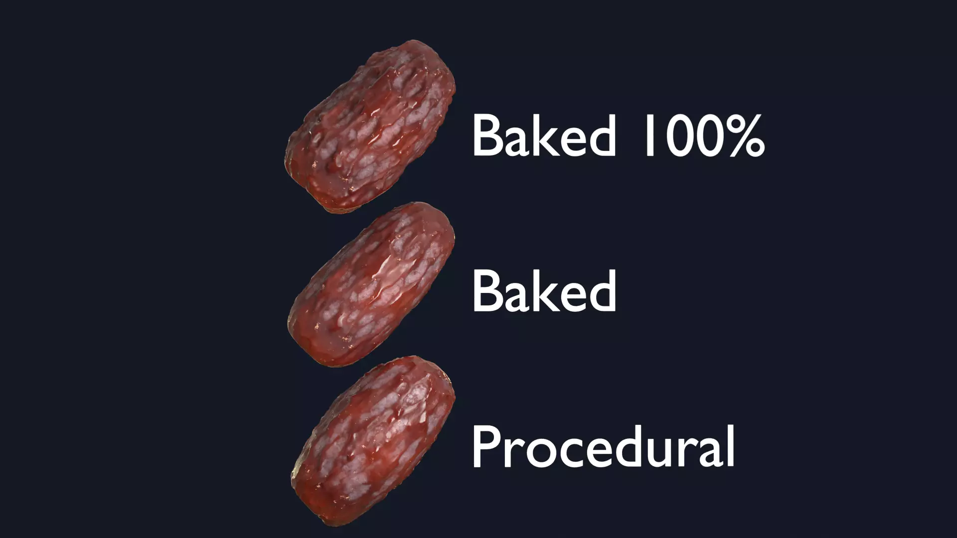 High-quality realistic 3D date model showcasing three different texturing workflows: 100% baked, baked, and procedural.The asset features detailed surface wrinkles, natural color variation, and glossy highlights for maximum realism.