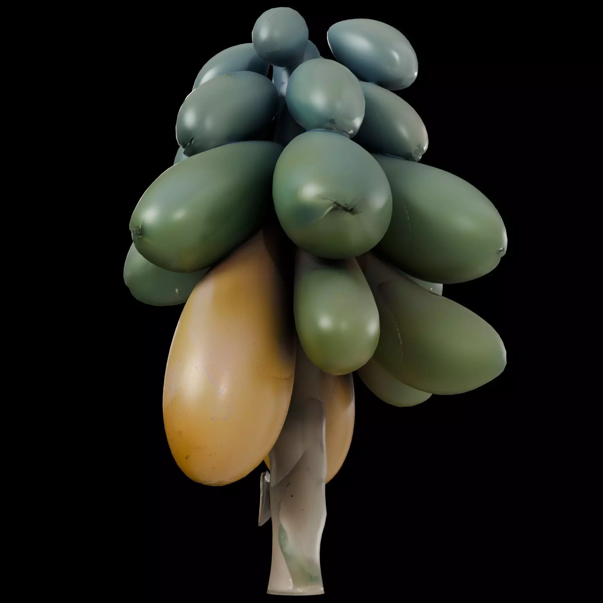 This stylized 3D model showcases a surreal bunch of papayas hanging from a digitally sculpted papaya tree. The fruits are depicted with a glossy, balloon-like texture, blending vibrant green and yellow hues to represent various ripening stages. The tree trunk and leaves are abstracted with smooth, artistic surfaces, giving the entire composition a playful, imaginative feel. Perfect for use in mobile games, tropical-themed animations, or educational content, this model adds a whimsical twist to a familiar fruit.Files: FBX,OBJ,STL,GLB