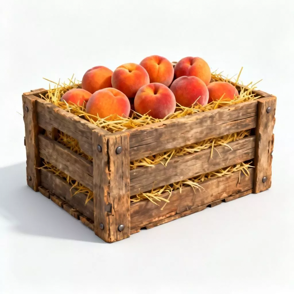 Ripe Fuzzy Peaches Inside the crate is a pile of large, ripe peaches. The skin texture features a beautiful gradient from golden yellow to deep red, and they look soft and fuzzy just like real fruit.