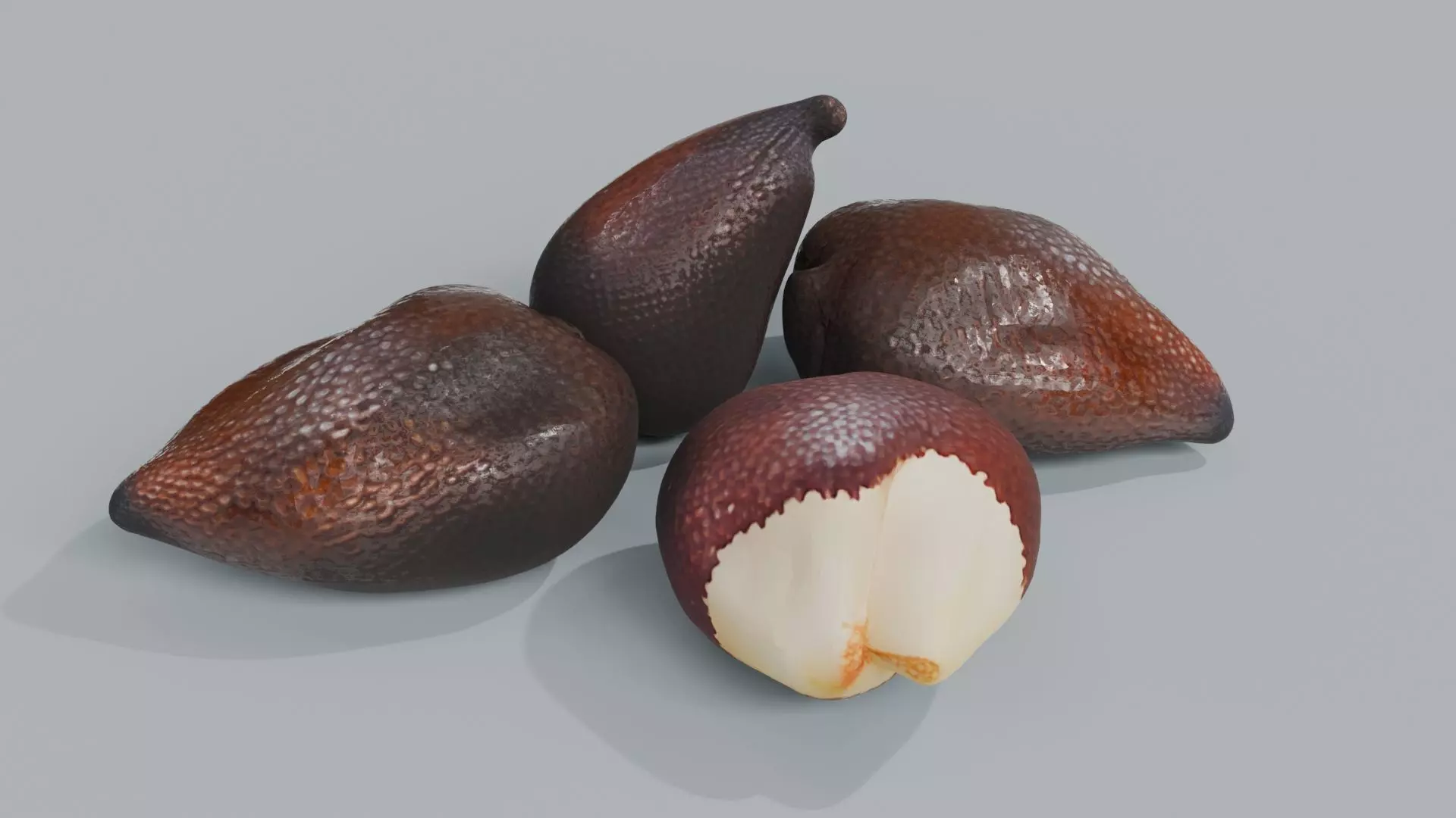 Enhance your tropical-themed 3D collection with this high-poly model of Salak, commonly known as snake fruit due to its reddish-brown, scaly skin that resembles snake scales. Native to Indonesia, Salak is a teardrop-shaped fruit prized for its sweet and tangy flavor. This model features four detailed representations, including a peeled version revealing the creamy white edible flesh inside. The glossy, textured surface and realistic anatomy make it ideal for culinary visualization, educational content, or exotic product design.The asset is provided in FBX, OBJ, STL, and GLB formats, compatible with most 3D platforms. While the STL format allows for potential 3D printing, please note that editing, customization, and adjustments are required to optimize printability—especially for the skin texture and internal geometry. The mesh is high-poly with unclean topology, so retopology is recommended before using in production, animation, or printing workflows.