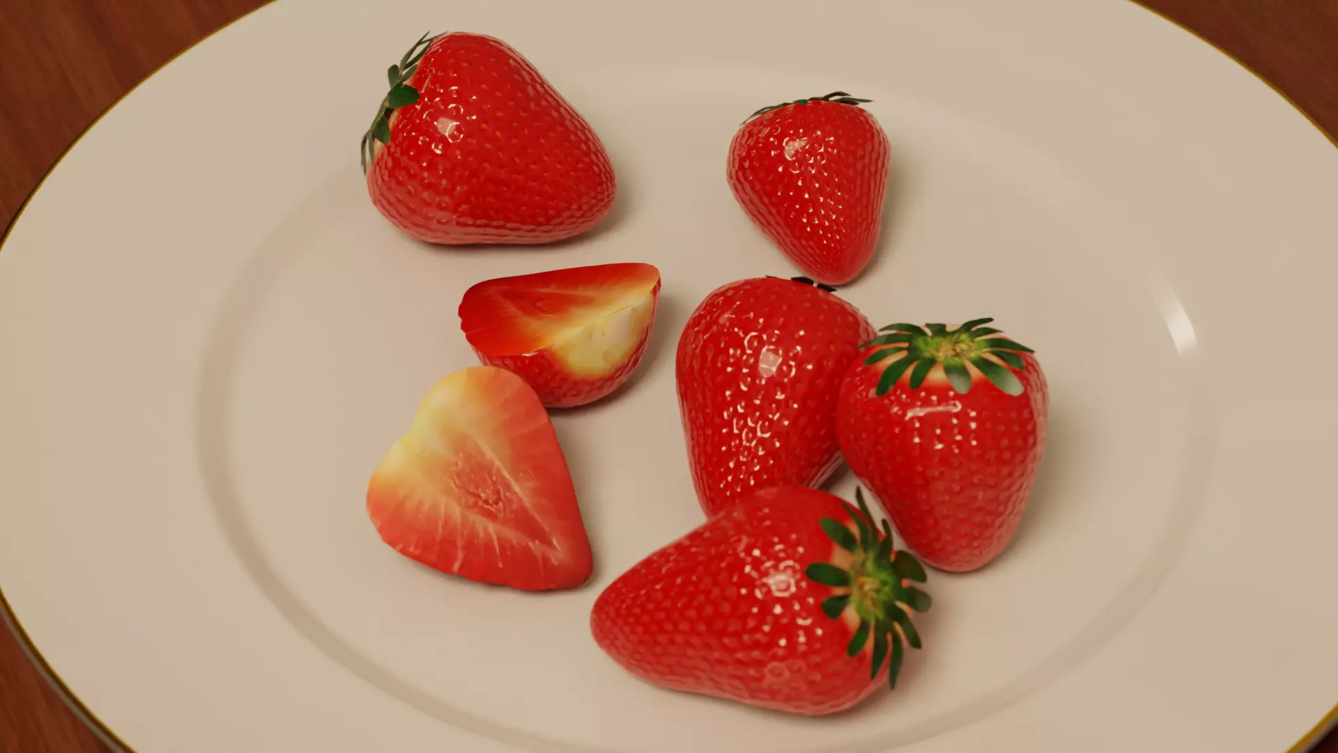 Set of 5 different Strawberries and two halves of the same fruit, Plate is also included. Delivered with 4k maps for realistic scenes.