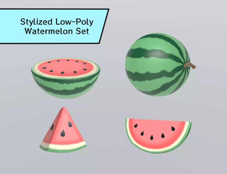 Create bright, refreshing, and stylized scenes with this low-poly watermelon set. This collection includes four unique watermelon variants — a whole watermelon, a half-cut watermelon, a slice, and a wedge. Each model is crafted with smooth stylized shading and clean shapes, perfect for food-themed games, mobile environments, summer scenes, or stylized renders. The set maintains performance-friendly geometry while preserving a charming visual appeal.