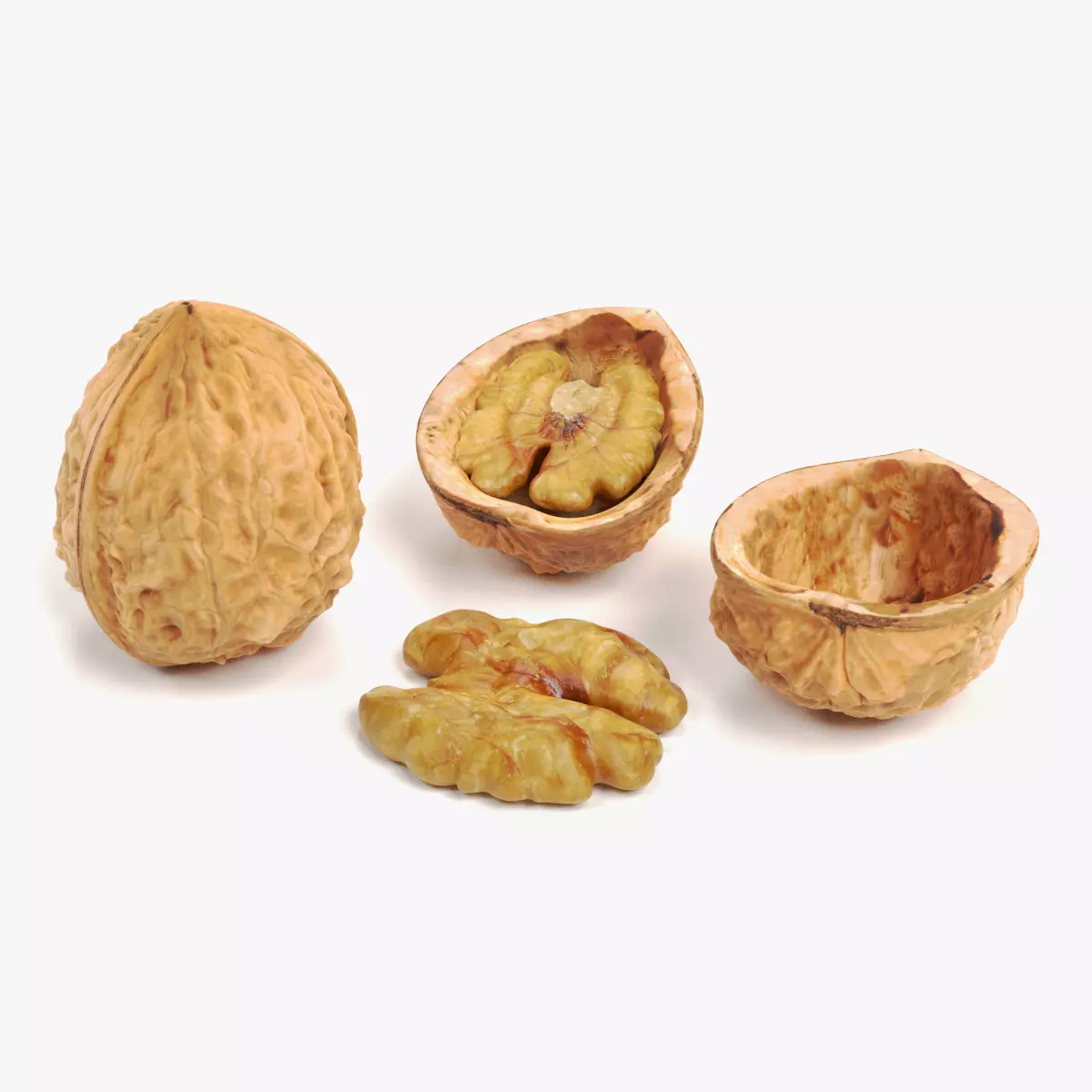 A comprehensive organic collection featuring four distinct walnut assets: a whole shell, two individual shell halves, a standalone kernel (Juglans regia), and a pre-configured assembly of a kernel nested within a shell half. This modular set provides full creative flexibility, allowing for seamless transitions between closed, opened, and shelled states. Each component is designed with matching textural fidelity, ensuring a cohesive look across all variations in culinary or nature-focused visualizations.