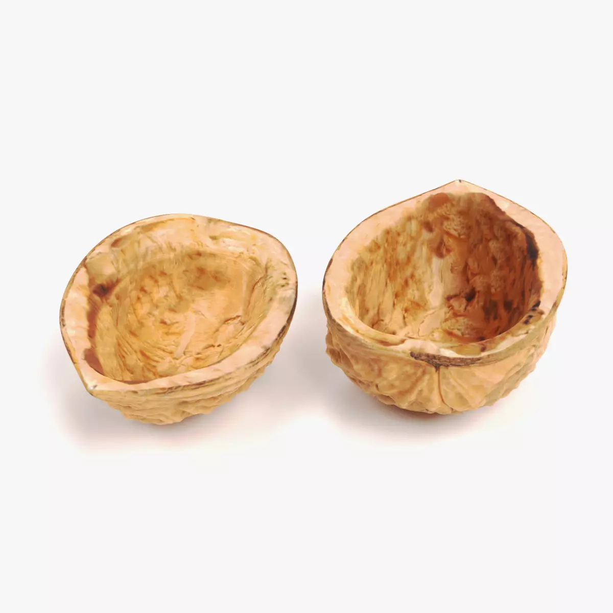 A pair of distinct walnut shell halves showcasing highly detailed organic patterns on both inner and outer surfaces. These unique geometries offer natural variety, making them perfect for realistic kitchen scenes, nature environments, or high-end product photography setups where macro-level detail is essential. The focus on textural depth ensures a lifelike appearance from any camera angle.
