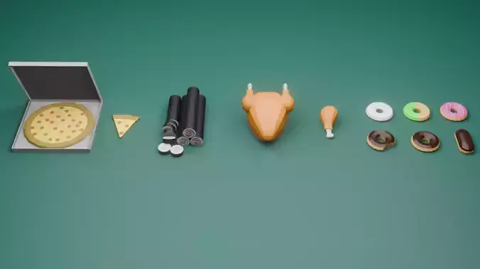 This is a 19 piece asset pack including 1 whole Pizza, 1 Pizza Slice, 3 Sushi Rolls, 1 Half Sushi Roll, 6 Sushi Roll Slices, 1 Whole Chicken, 1 Chicken Leg, and 6 assorted Donuts ( 1 Classic Dip, 1 Classic Dip with a Bite, 1 Long Donut, 1 Green Half Dip, 1 White Icing Dip, and 1 Pink Dip with Blue Drizzle). They are Low Poly, Game Ready and 3D Print Ready !