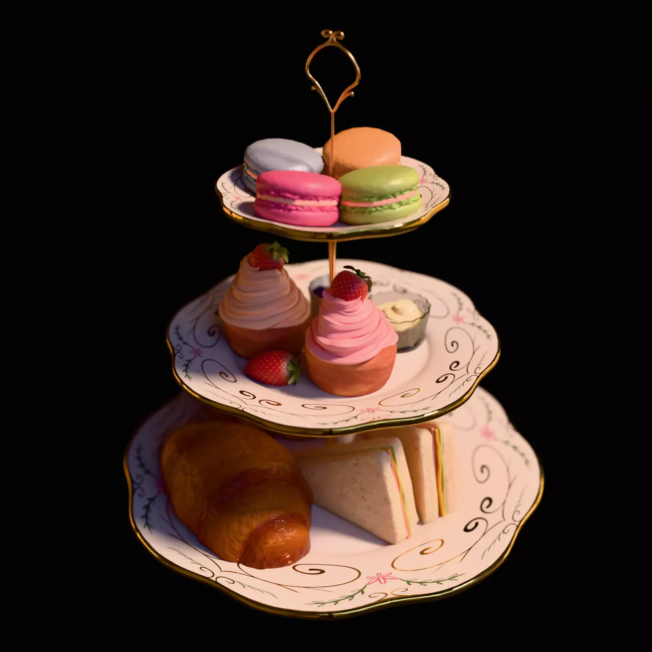 Included Items: 3-tier dessert stand, Strawberry dessert with cream, Macarons, Tea sandwiches, Croissant, and Jam/Clotted cream